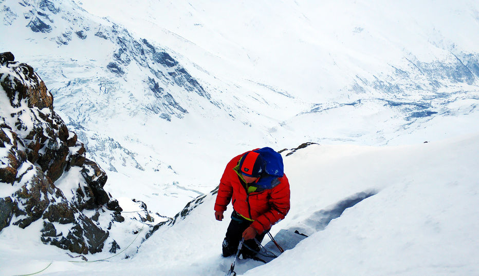 Innen az egyenesen tovább folytatódó jellegzetes főkuloárt jobbra elhagyva, a sziklatornyokra való feljutást céloztuk. Ide semmihez sem hasonlítható hófalon kellett felküzdeni magunkat. Legtöbbször már azt gondoltunk, ennek semmi értelme, hiszen inkább lefelé süppedtünk csak, de feljebb annál kevésbé haladtunk. Próbálom a talpammal tömöríteni, de nem tömörödik, ehelyett tovább süllyedek lefelé. Nem volt értékelhető kohézió a lábbal elérhető rétegekben, leginkább valami szétmorzsolt hungarocellnek felelt meg. Végül a „békának” elnevezett, helyben kifejlesztett technikával tudtam feljebb mászni. Mindez annyit jelentett, hogy a testsúly 50%-át nem a lábon, hanem a karokon adtam át a hófelszínnek. A csákányok nyelét felfektetve a hó tetejére, majd a lábat kifordítva a lábfej teljes belső élére helyeztem a testsúlyt. Mintha az átadott erő vektora a lejtővel közel párhuzamos irányú lenne. A lényeg, hogy minél kevesebb időt töltsünk egy mozdulattal, így sietősen kellett felfelé „békázni”. Persze ez sem volt tökéletes, de már érződött valami haladás annak ellenére, hogy iszonyatosan fárasztó volt. A sziklatornyok alá érve jobbról egy rövid hógerinc húzódott. Ebbe beülve testről próbáltam Andrisnak a felfelé haladásban segíteni úgy, hogy karból testbiztosítással húzom.