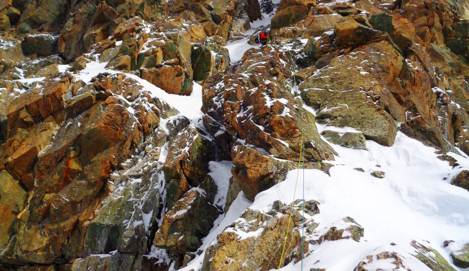 A fal tövéig fagyott lavinanyomokon másztunk, ahol több lehetőséget mérlegelve végül a kuloárt választottuk. Ez sem volt könnyebb variáns, hiszen sajnos egy markáns jégfal zárta le rögtön a továbbjutást, aminek jege a kidőlő sziklafalon nem ért fel maradéktalanul, hiába hívogatott izgatóan. Ezért inkább a jég bal oldalán a sziklák aljáig másztunk, ahol végül megfelelő kapaszkodókat találtunk a további felmászásra. A másik két csapat itt némi időveszteség árán még egy könnyebb, WI 2-3-as nehézségű jégmászásba bonyolódott.