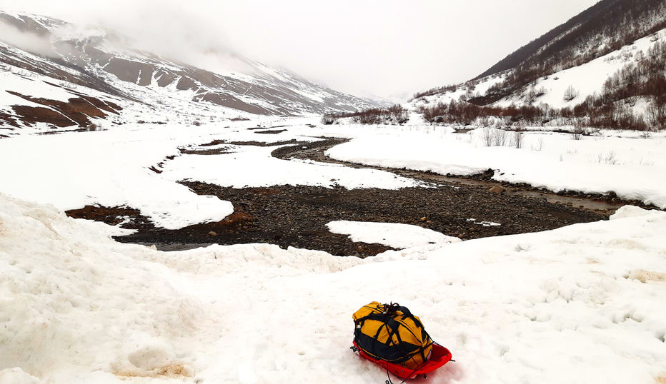 Irány a faluba vissza. Szintén korán indultunk, hogy a romló időjárást megelőzve kevésbé kapjunk csapadékot, és hátha lesz fagy. Sajnos egyik sem igazolódott be. A hó a hótalpak és a sílécek alatt is beszakadt, és közben esni kezdett az eső. Hiába a téli időszak, a klímaváltozás már itt is érezteti meleg szellőit, és ez 2300 méteren esőként mutatkozik. A patakátkelők kiolvadtak, így egymást segítve cipeltük át szánjainkat a patakokon. Átázva értük el a falu határát, ahol a határőr már a domb tetejéről intett, hogy arrafelé menjünk. Végül papír nélkül is meggyőzödött róla, hogy bár Oroszország felől érkeztünk vissza Ushguliba, mégis ártalmatlanok vagyunk. A szállás eléréséhez két lehetőségünk volt: vagy a sáros-tehénkakis úton megyünk, vagy át a dombon a mély hóban. A dombon mentünk, mert a szánt ott tudtuk húzni. Sajnos egyértelművé vált, hogy a tél véget ért.